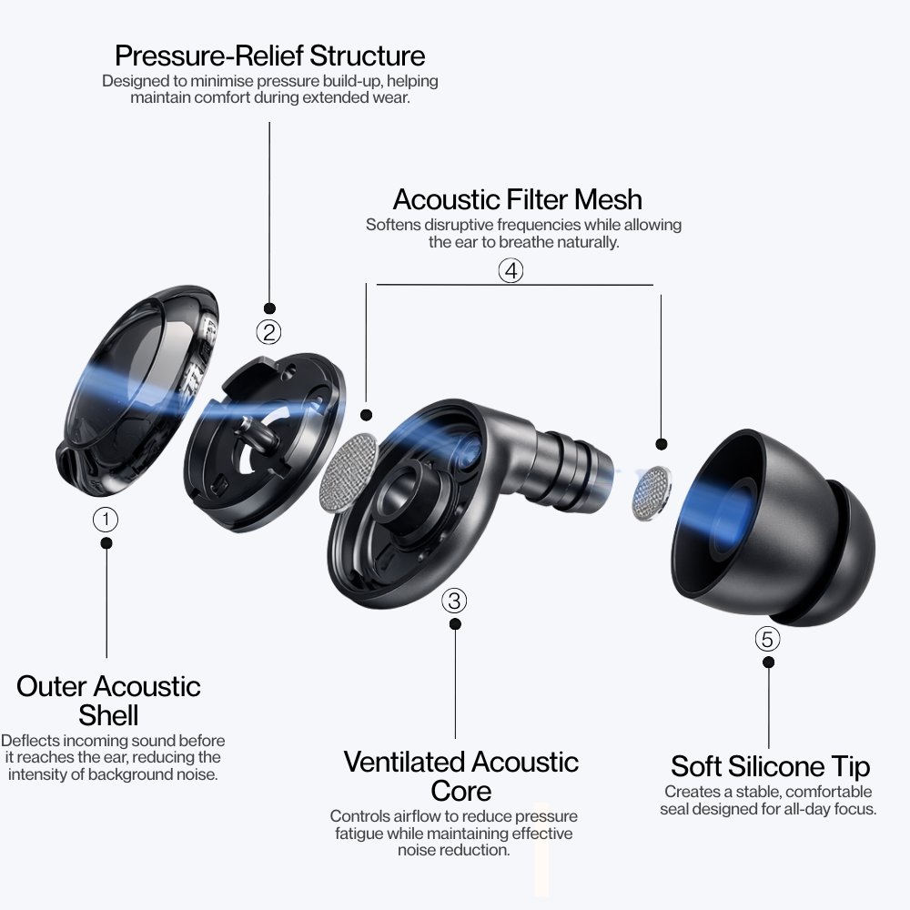 Most noise solutions weren’t designed for focus. They either block too much, demand technology, or become uncomfortable over time. Mono is built specifically to reduce distraction and protect attention in everyday environments.