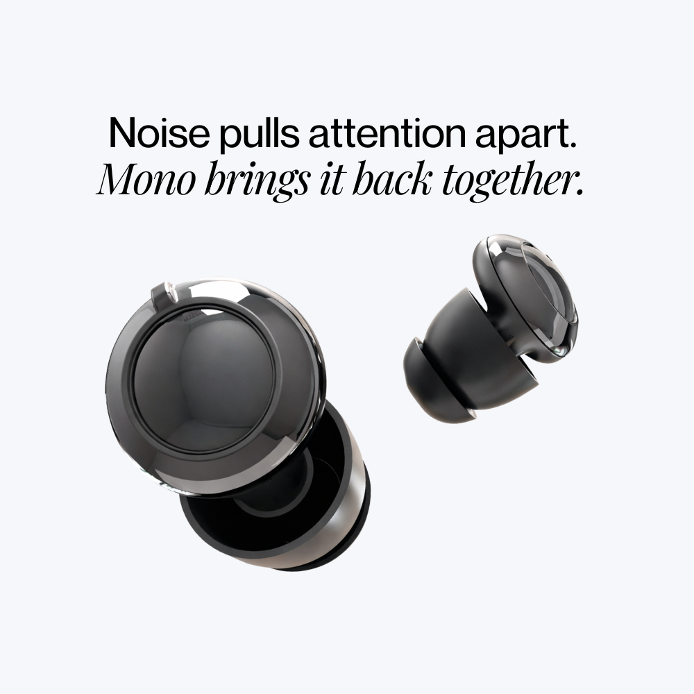 Most noise solutions weren’t designed for focus. They either block too much, demand technology, or become uncomfortable over time. Mono is built specifically to reduce distraction and protect attention in everyday environments.